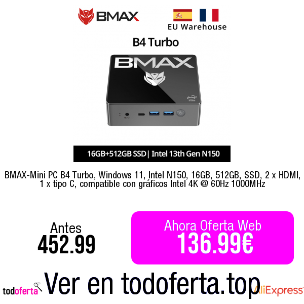 BMAX-Mini PC B4 Turbo, Windows 11, Intel N150, 16GB, 512GB, SSD, 2 x HDMI, 1 x tipo C, compatible con gráficos Intel 4K @ 60Hz 1000MHz
