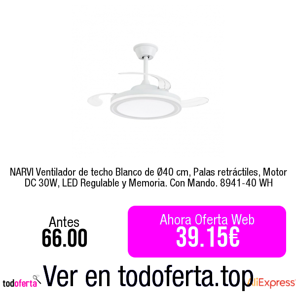 NARVI Ventilador de techo Blanco de Ø40 cm, Palas retráctiles, Motor DC 30W, LED Regulable y Memoria. Con Mando. 8941-40 WH