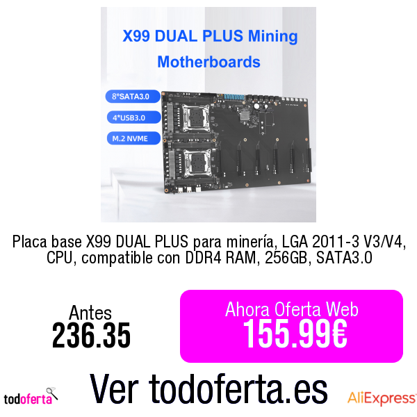 Placa base X99 DUAL PLUS para minería, LGA 2011-3 V3/V4, CPU, compatible con DDR4 RAM, 256GB, SATA3.0 12/05/2025 por santiPlaca base X99 DUAL PLUS para minería, LGA 2011-3 V3/V4, CPU, compatible con DDR4 RAM, 256GB, SATA3.0 Ver en Aliexpress Redes Sociales TodofertaProductos relacionados:Placa base X99 DUAL PLUS para minería, LGA 2011-3…Placa base Dual X99 F8D PLUS X99 placa base de CPU…Juego de placa base MACHINIST X99 RS9 X99 con…Placa base HUANANZHI X99 F8D PLUS LGA 2011-3 XEON…MACHINIST-placa base X99 PR9, compatible con LGA…MACHINIST RS9 X99 placa base compatible con Xeon E5…
