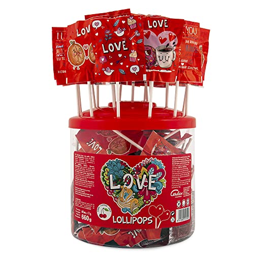 Caramelos Cerdán – Piruletas Corazón Love Sabor Cereza | Tarro de 60 Unidades | Caramelo Duro con Palo Sin Gluten ni Alérgenos | Ideal para San Valentin y Cumpleaños.