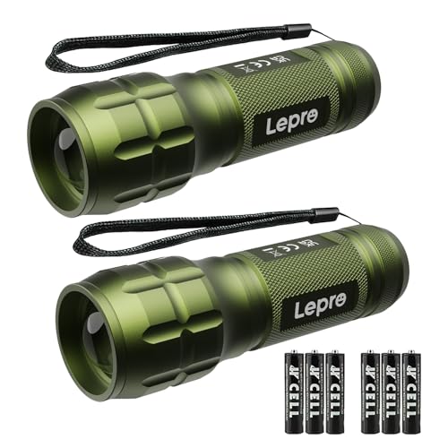 Lepro Linterna LED Alta Potencia LE1000, Linterna LED Portátil con Zoom, IPX4 Impermeable Linterna Táctica Militar para Ciclismo, Camping, Senderismo etc. 3 AAA Pilas Incluidas [2 PACK] Verde