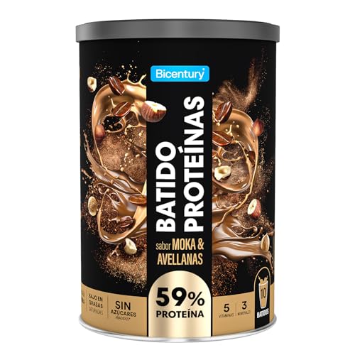 Bicentury Batido de Proteína Sabor Moka & Avellana, Rico en Fibra, Sin Azúcares Añadidos, Bajo en Grasas, Optimo para la Recuperación Muscular, 340 g, 10 raciones Moka & Avellana