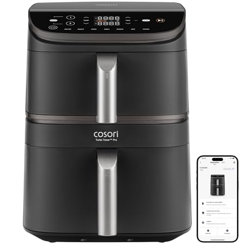 Cosori Turbo Tower 10.8L Smart Air Fryer 2630W, Cestas Dobles con Recubrimiento Cerámico Seguro con DC Motor y Dual Blaze, Más Rápida y de Bajo Consumo, 7 Funciones, Ahorra Espacio, Fácil de Limpiar