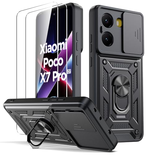 Oududianzi – Funda para Xiaomi Poco X7 Pro 5G[2 Protector Vidrio Templado], con Cubierta Deslizante de la Cámara, Soporte Giratorio de 360 ° y Funda Protectora TPU de Silicona – Negro