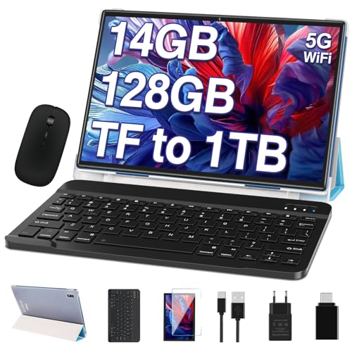 2025 Newest Android 13 Tablet 10 Pulgadas 14GB RAM + 128GB ROM (1TB TF), 8000mAh, Octa-Core 2.0Ghz, GPS, 5G + 2.4G WiFi, Bluetooth 5.0 | 5+8MP | Type C | Tablet PC con Funda, Teclado e Ratón – Azul